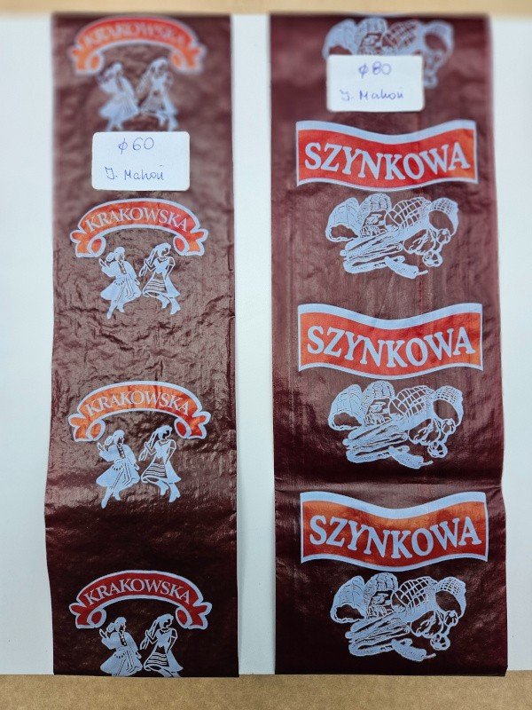 Osłonka fibrus/faser kal. 60 j.mahoń, nadruk 1 stronny, do wędzenia lub tylko pieczenia/parzenia, klipsowania - dobrze zdejmowalna.